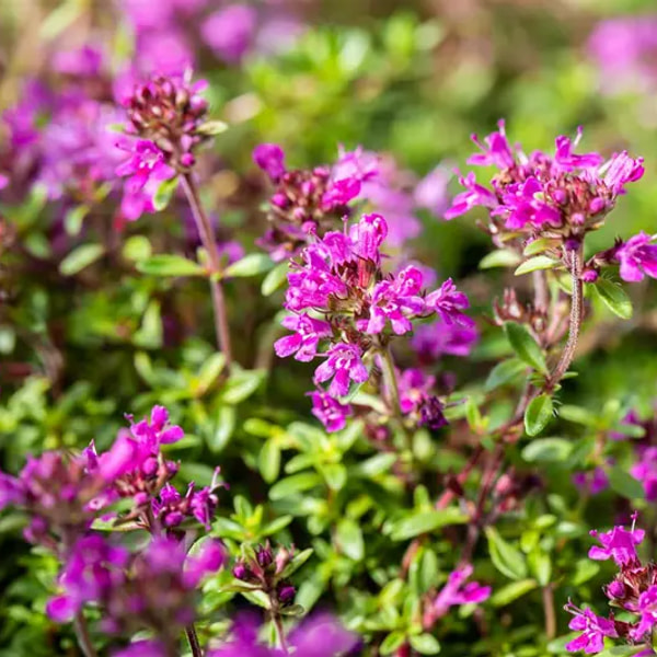 Ein Thymian mit limettengrünem Blatt und einer Fülle violetter Blüten. Die Blätter verströmen ein Zitronenaroma. Großartig für Gefäße, Steingärten und trockenheitsliebende Beete.